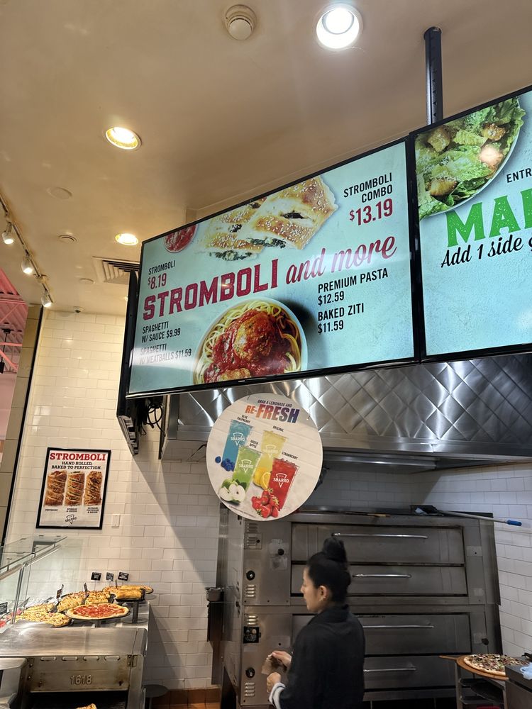 The menu highlights their famous NY Pepperoni and Jalapeño Slice, made with fresh, hand-stretched dough and San Marzano-style tomato sauce. Each slice is generously topped with 100% whole milk mozzarella and spicy jalapeños for a kick. Priced at just $7.49, it’s a must-try!